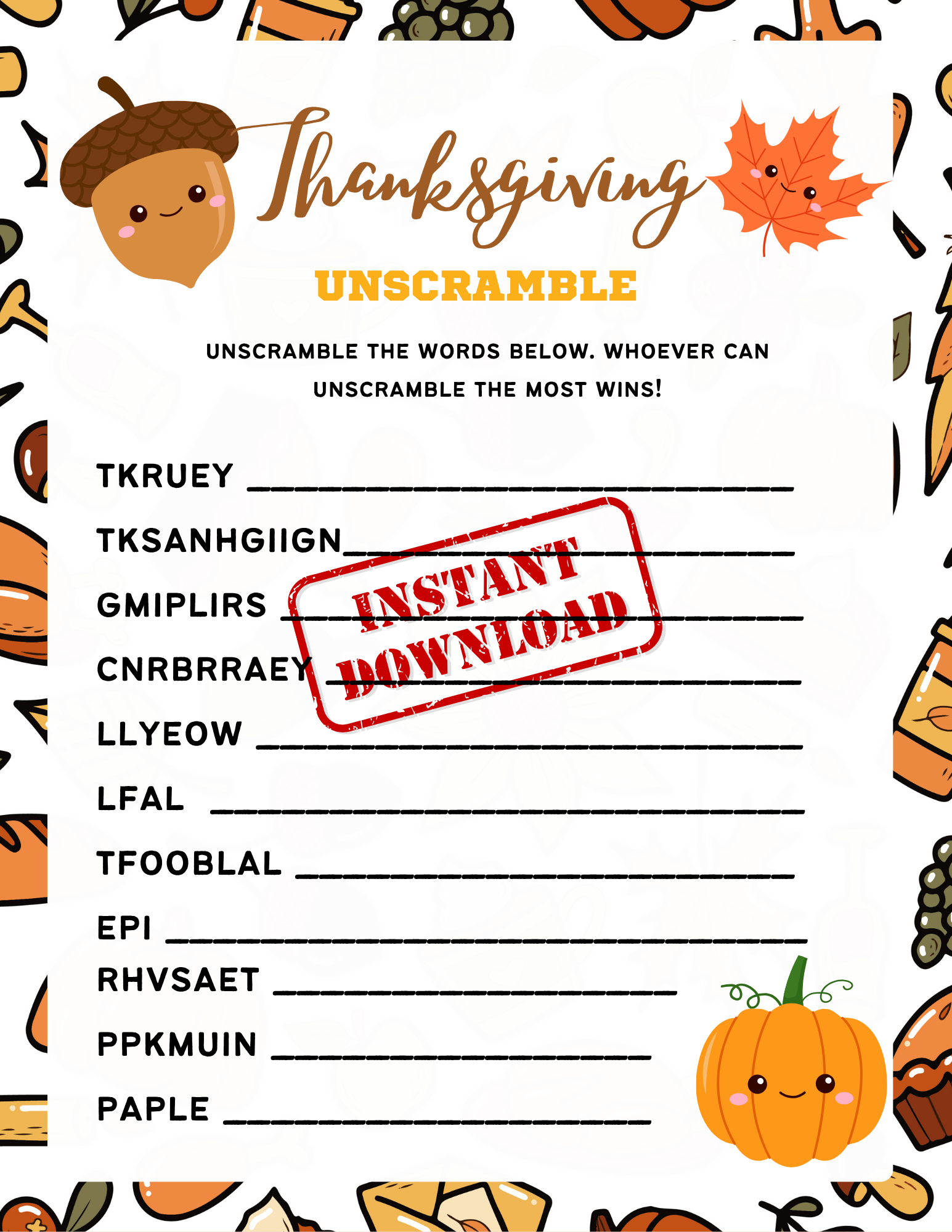 Cute Kawaii Thanksgiving Unscramble Game Printable Template - Game for Kids, Activity for Kids, Thanksgiving Activity