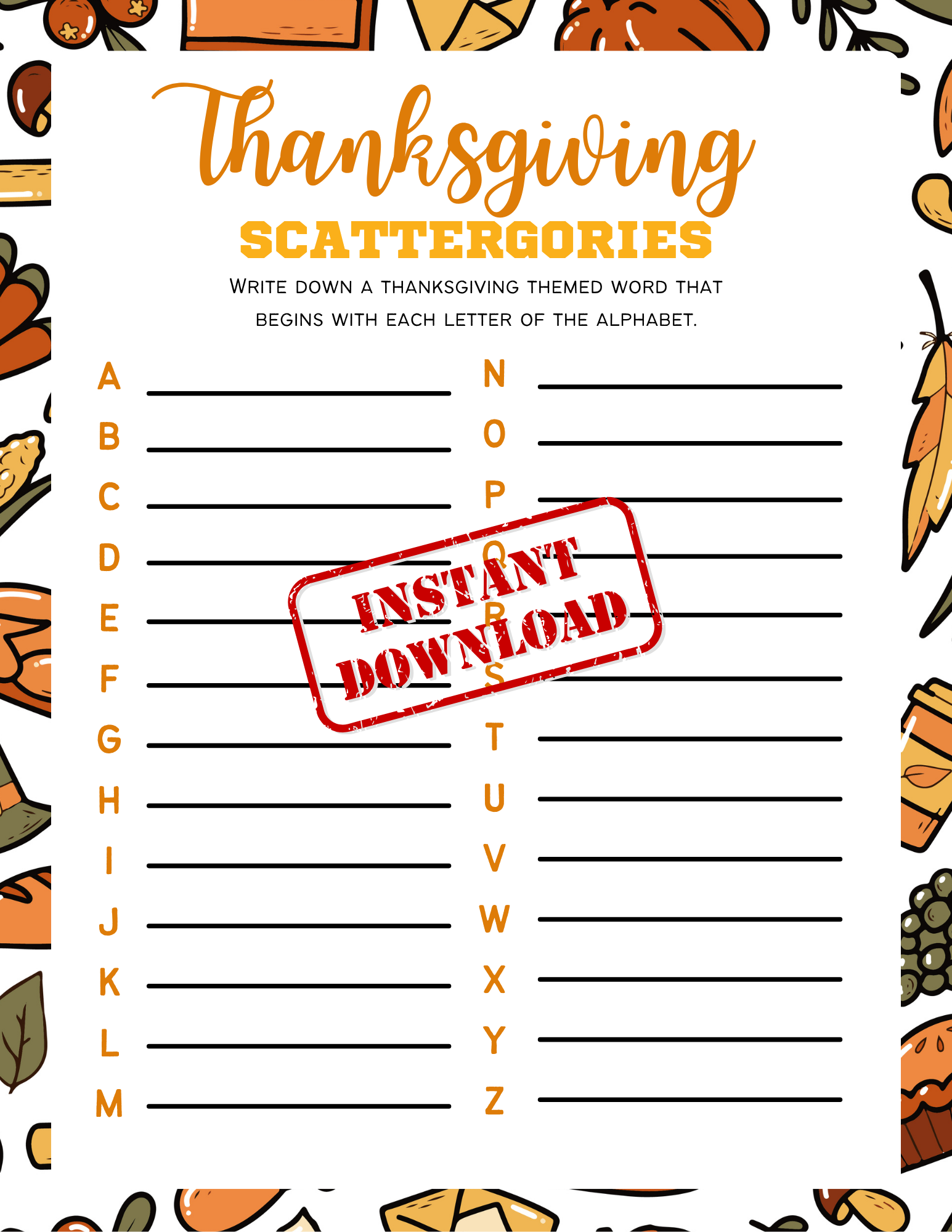 Thanksgiving Scattergories Printable Template - Thanksgiving Games , Thanksgiving Party Games, Classroom Activity
